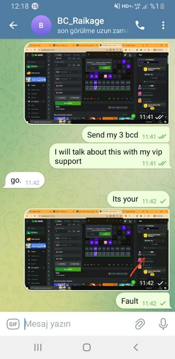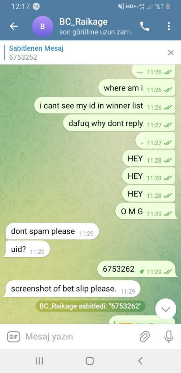 1. I won the "100x sword 10 winner 3bcd" event organized by @BC_Raikage by submitting my bet ID as 6th. @BC_Raikage congratulated me on completing it. and then forgot to add my id to the list. Even though I warned him, he did not add it and the event, which lasted another 20 minutes, was finally concluded. Even though I told him that my ID number was still not on the list, he did not add it and blocked me from Telegram and Global Chat to suppress his own mistake.. my bet id : https://bc.game/#/sd/122DWZ7OOJBA5J and i send my bet id chat same time you can check photos. And he immediately congratulated me....... I am adding this as a photo......