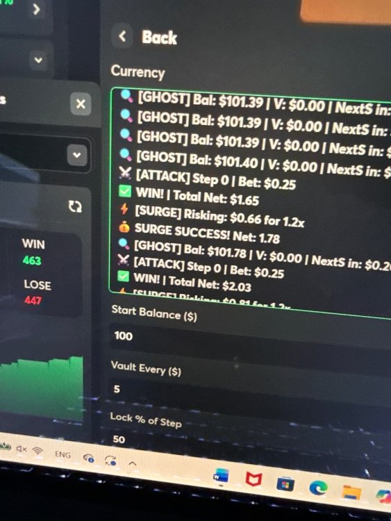 2. Hi everyone, I’ve been refining a new system for a while now, and I wanted to share the results. I call it the Analytical Vault (V11.0). Unlike basic scripts that just follow a fixed pattern, I designed this one with a "brain" that constantly re-calculates its own safety net. It operates across different mental states: GHOST mode for low-risk observation, ATTACK mode for calculated strikes, and a SURGE mode that compounds profits only when the session is going well. The most important part is the Vault mechanism. Every time the system hits a profit milestone, it automatically "locks" a portion of those winnings. It essentially moves the money to a safe area where the script can't touch it, while simultaneously tightening the Stop Loss to protect what’s already been earned. It’s built for players who are tired of winning and then losing it all in one bad streak. It’s about securing the green as you go. I’m looking to share this with a small group of serious, high-tier players. If you understand how a risk-management system like this works and you’re interested, reach out