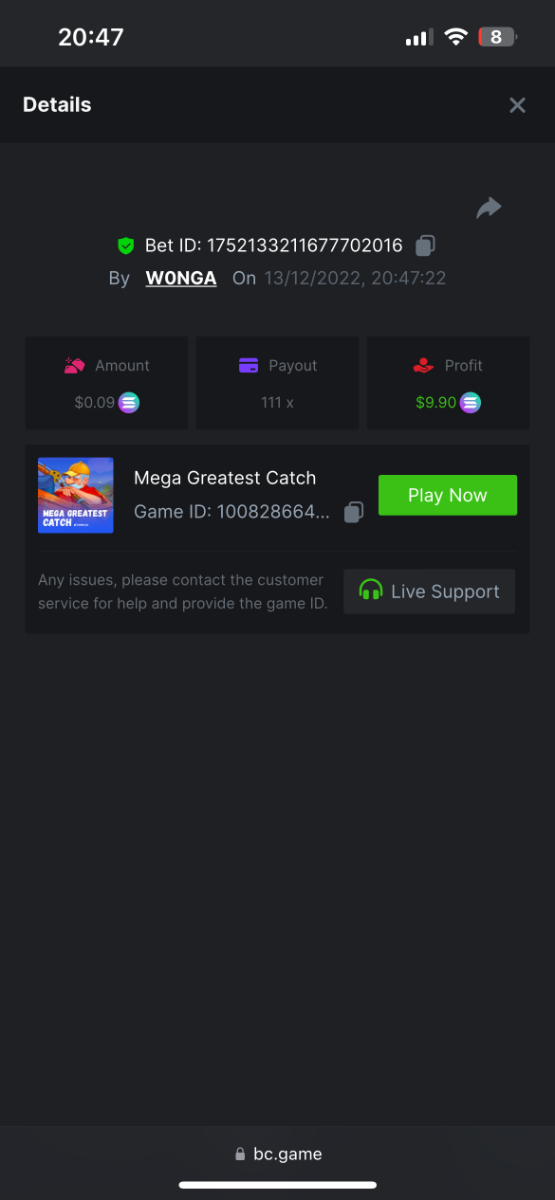 5. https://bc.game/#/sd/10YFF23M9VN76B This was a clean 50x win on $0.10! But the the dollar conversion says different. https://bcgame-dk2.pragmaticplay.net/gs2c/lastGameHistory.do?symbol=vs10bbbonanza&mgckey=AUTHTOKEN@11cc628b718a1c586678b11736e84ea3dfa730c7917478308de6e25bef028d13~stylename@bcgame_bcgame~SESSION@23942c19-4f81-4335-ac9a-6cefff7f9a75~SN@192ffaf4&tz=-00%3A00&mgckey=AUTHTOKEN@11cc628b718a1c586678b11736e84ea3dfa730c7917478308de6e25bef028d13~stylename@bcgame_bcgame~SESSION@23942c19-4f81-4335-ac9a-6cefff7f9a75~SN@192ffaf4 https://bc.game/#/sd/10YFG753VMQS5V https://bc.game/#/sd/10YFGJAIT2RMS3 https://bc.game/#/sd/10YFGXMC5YV8K3 https://bc.game/#/sd/10YGZ4VK6RWOIB