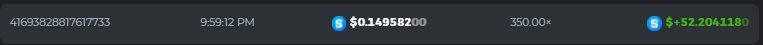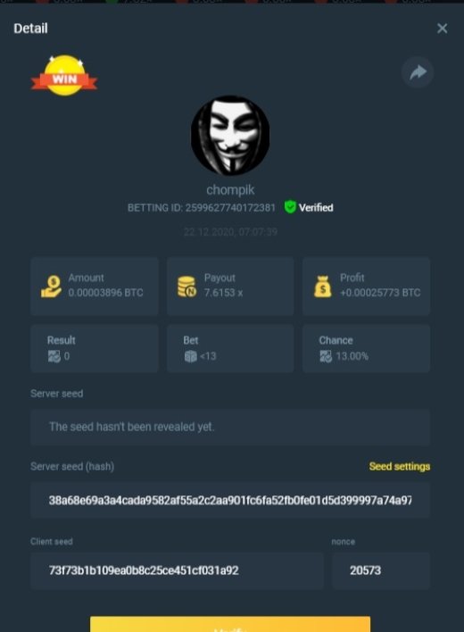 4. Username : chompik Bet-ID : 2599627740169779 Amount : 3.2 TRX (0.10$) Result : 0 --------------------------------------------------------- Bet-ID : 2599627740171432 Amount : 0.00004545 BTC (1.05$) Result : 12.25 -------------------------------------------------------- Bet-ID : 2599627740172381 Amount : 0.00003896 BTC (0.90$) Result : 0