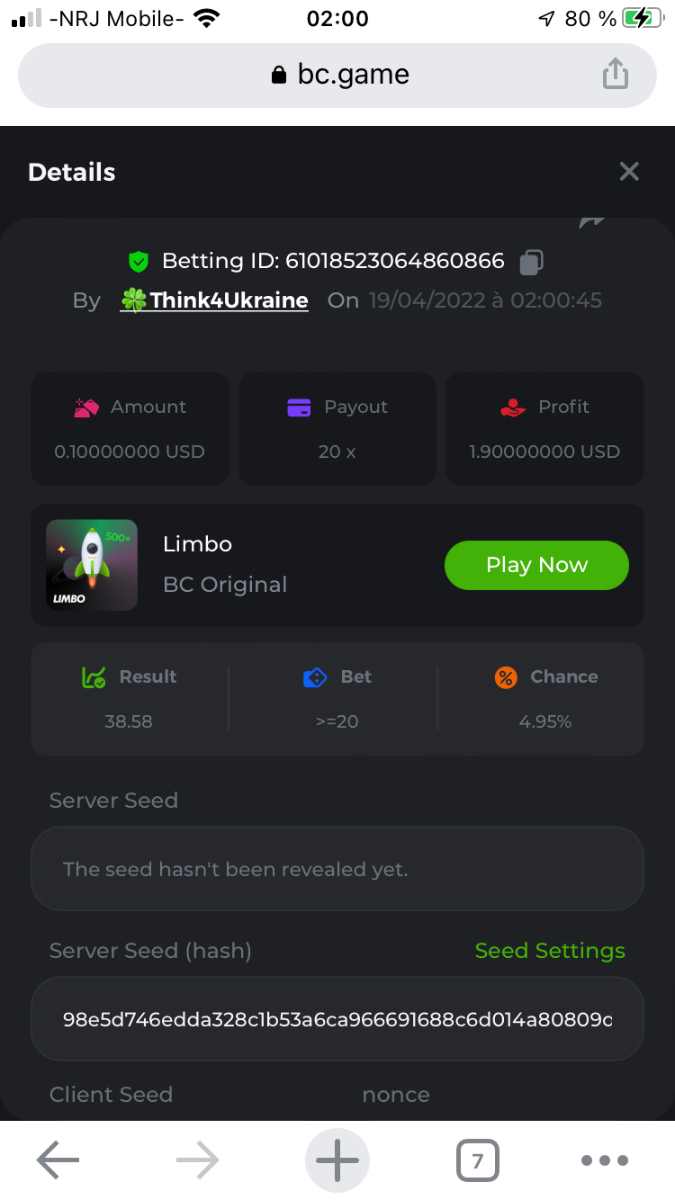 2. Hello i don’t have photo of I’d gaming because I have joke after but I have a screenshot of my bet here mY ID to this game : MY PAYOUT ITS x 115 ~_ I thinks 18550904349273521 27/02/2022 à 22:53:55 my payout it’s x 115 _~ i think i spare it’s ok ! thansk Wrong participation