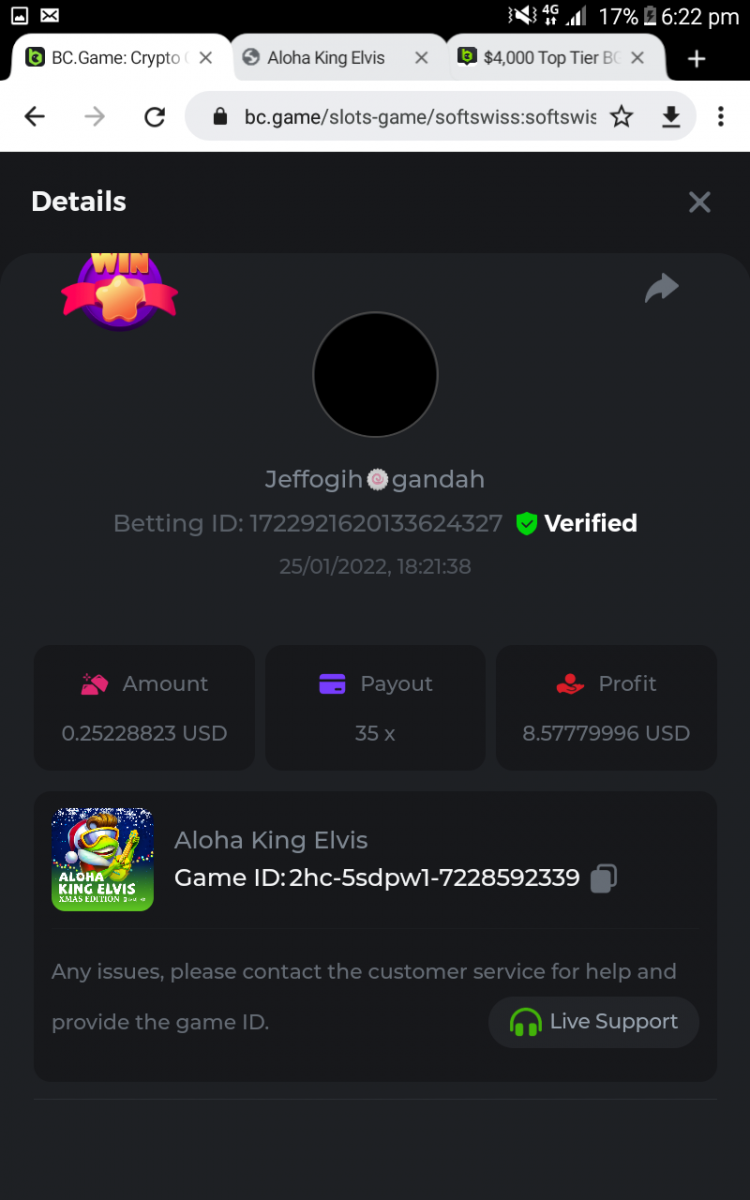 Betting ID: 1722918907131376000 Bonanza Billion 26.55X Betting ID: 1722919814773462791 Johnny Cash 104.00X Betting ID: 1722921034496230407 Aloha King Elvis 27.20X Betting ID: 1722921620133624327 Aloha King Elvis 35.00X Betting ID: 1722922632449218432 Aloha King Elvis 49.60X Betting ID: 1722933864435497735 Bonanza Billion 83.76X