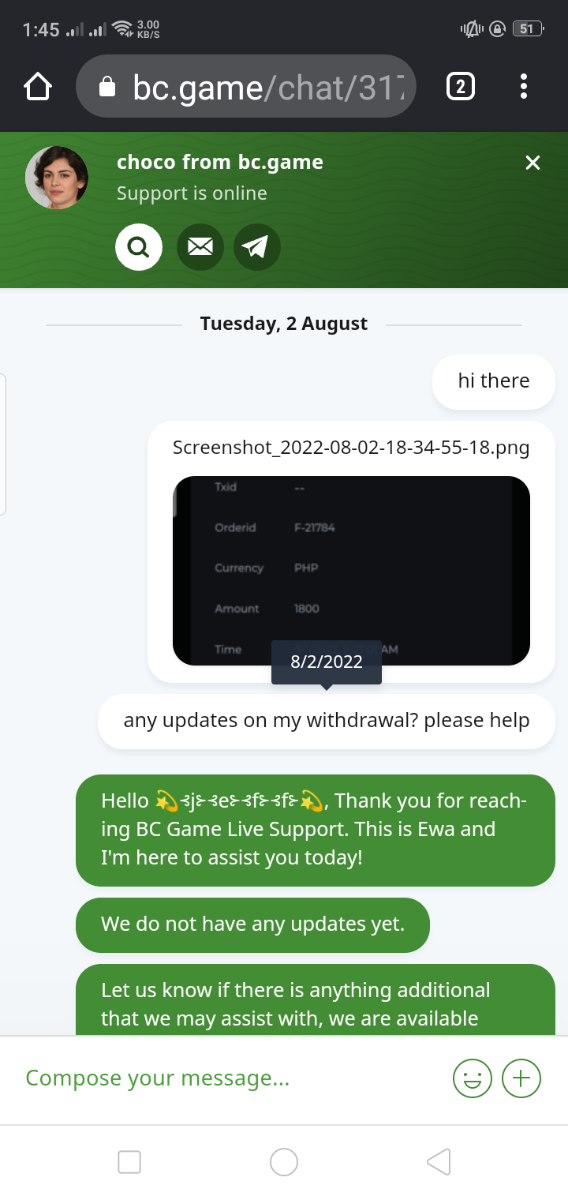 Please check the screenshots, and it will explain on how very poor the service of bc.game live support. No wonder, even the CS Manager of bc.game is not practicing a good customer service. I am just wondering on why bc.game  management is allowing such things, or do the management know what is really happening? Idk... I hope that a little improvement may happen in the future.