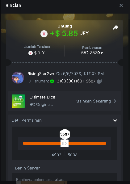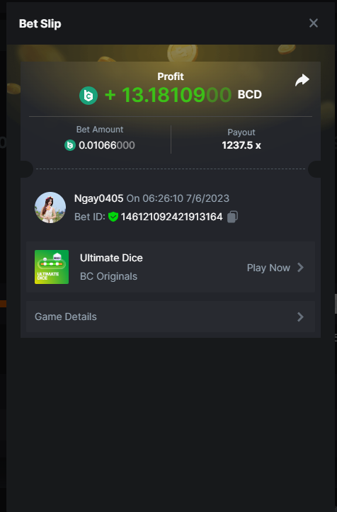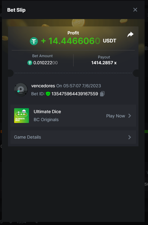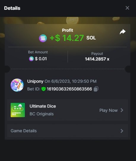 Maksypro Posted June 6, 2023 Share Posted June 6, 2023 Read Carefully Before Start To Hunt Daily Challenges #258 ULTIMATE DICE Hunt : Win the highest multiplier Min Payout requirement 100x Min Level 4 ๏ธDuration Starting : Now End time : 23.59 UTC Time How to Join? Make screenshot + paste your bet link + UID or Profile link Any coin, with min bet 0.01 USD is allowed (jb/bb/bcl not allowed) Reward Prizes 1st Place.....$7 BCD 2nd Place.....$5 BCD 3rd Place.....$4 BCD 4th Place.....$3 BCD 5th Place.....$2 BCD ๐ต Winners will be announcing next day after Roll Point! 1 Link to comment Share on other sites More sharing options...