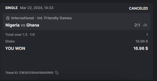 I bet this game, perfect odds, not any problem with event or odds, I won it, bet was resolved as WIN, after some minutes they changed to cancel, well, its hard to win sports bet and now BC is cancelling bets without any plausible reason, thieves, I asked them and they told that they won´t refund because of a odds error, there was definetely not and error with a 1.X odds. BC sports is TERRIBLE.