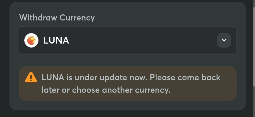 I have over $1000 worth of Luna that I want to withdraw. Yet, everytime I go to try take it out there Is a notification saying it is "under update for now". I would never have deposited the Luna in the first place if I knew this was the case. There is also no way to swap it to stablecoin like other coins. So, I'm basically trapped with no ETA when I will be able to get my money out. Please help