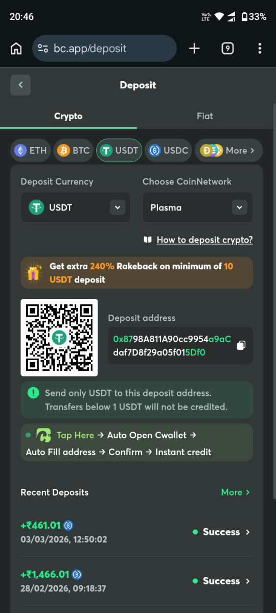 Warrior777 Posted March 10 Share Posted March 10 Hi Team, I had deposited USDT on Plasma network in bc.game but it was not credited. Time: 2026-03-09 20:23:59 Receiving: 55.233757 USDT Network fee: 0.1 USDT Network: Plasma (USDTO) Withdrawal address: 0x8798A811A90cc9954a9aCdaf7D8f29a05f015Df0 TXID: 0xa64f23d0b8544cb77a88211d2904c43457e5129c660f701d88582a97926f4c70 Plasma network - https://plasmascan.to/tx/0xa64f23d0b8544cb77a88211d2904c43457e5129c660f701d88582a97926f4c70 I have contacted the bc.game live support but they keep asking for order id but it was not generated. I request the team to please look into the issue, the attached screenshot and plasma network and credit the USDT to my account. My userid is 1046452 Warrior777 Regards Link to comment Share on other sites More sharing options...
