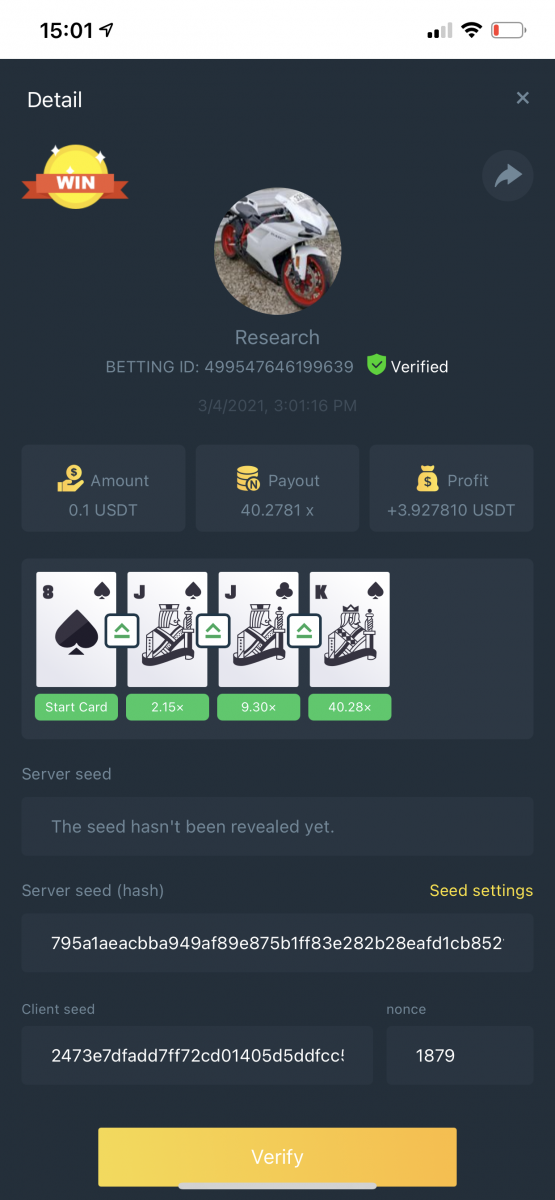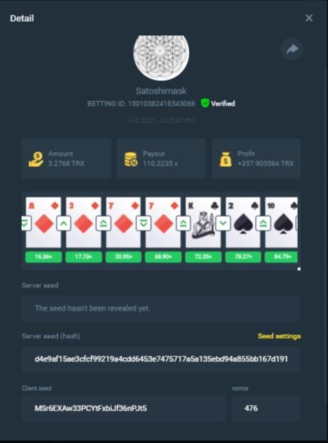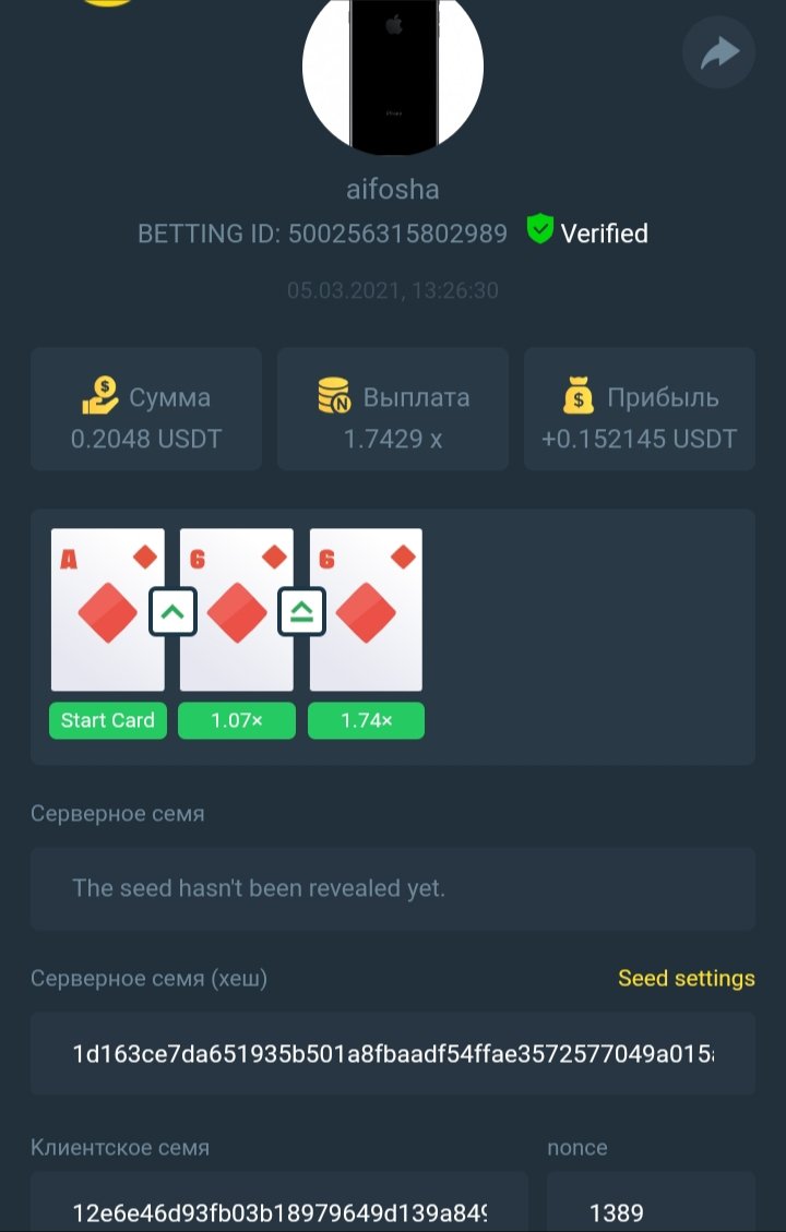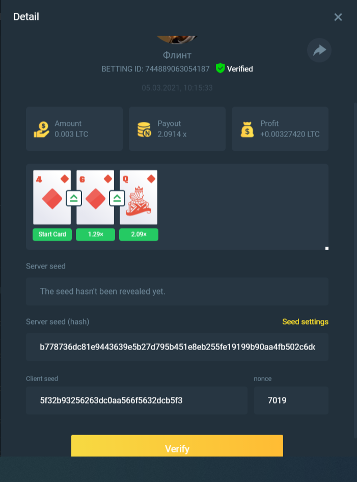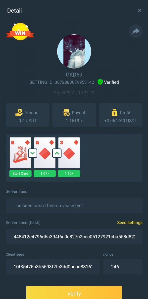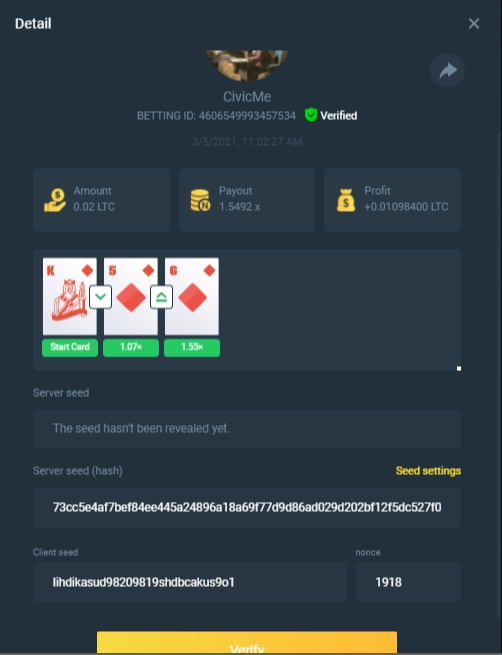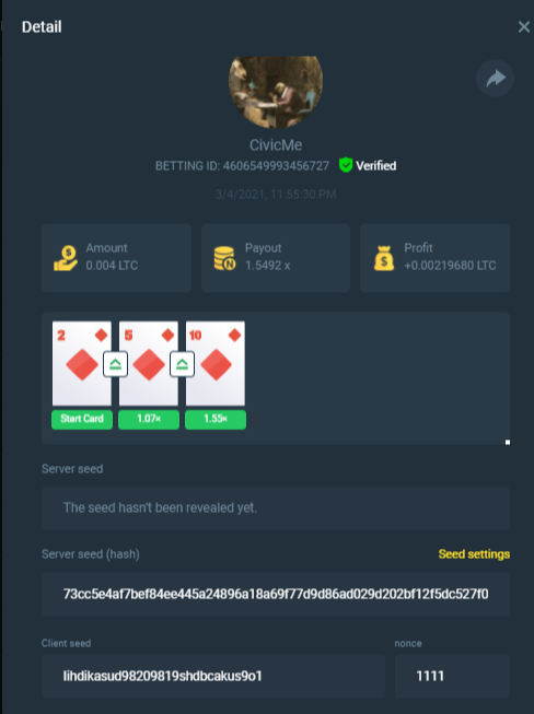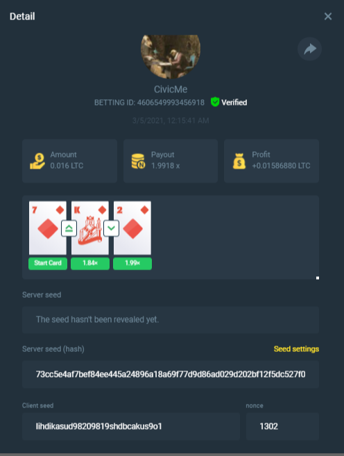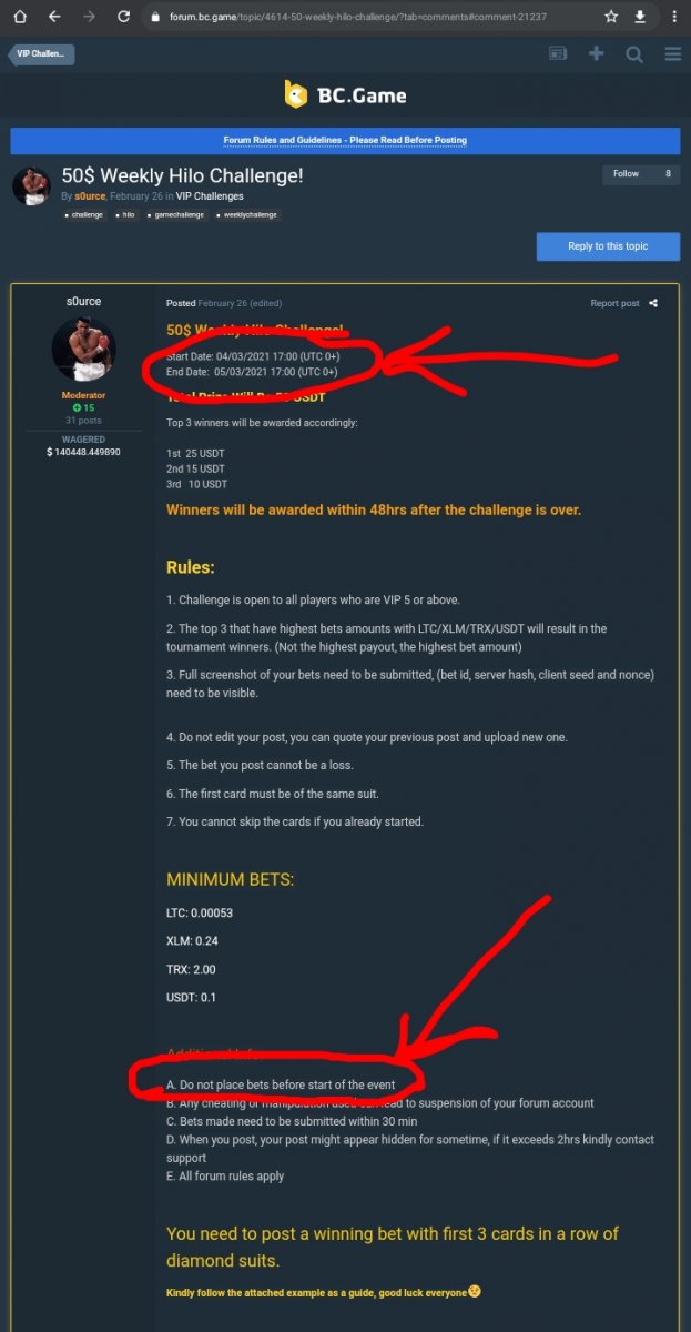 s0urce Posted February 26, 2021 Share Posted February 26, 2021 50$ Weekly Hilo Challenge! Start Date: 04/03/2021 17:00 (UTC 0+)End Date: 05/03/2021 17:00 (UTC 0+) Total Prize Will Be 50 USDT Top 3 winners will be awarded accordingly:1st 25 USDT2nd 15 USDT3rd 10 USDT Winners will be awarded within 48hrs after the challenge is over. Rules: 1. Challenge is open to all players who are VIP 5 or above. 2. The top 3 that have highest bets amounts with LTC/XLM/TRX/USDT will result in the tournament winners. (Not the highest payout, the highest bet amount) 3. Full screenshot of your bets need to be submitted, (bet id, server hash, client seed and nonce) need to be visible. 4. Do not edit your post, you can quote your previous post and upload new one. 5. The bet you post cannot be a loss. 6. The first card must be of the same suit. 7. You cannot skip the cards if you already started. MINIMUM BETS: LTC: 0.00053 XLM: 0.24 TRX: 2.00 USDT: 0.1 Additional Info: A. Do not place bets before start of the eventB. Any cheating or manipulation used can lead to suspension of your forum accountC. Bets made need to be submitted within 30 minD. When you post, your post might appear hidden for sometime, if it exceeds 2hrs kindly contact supportE. All forum rules apply You need to post a winning bet with first 3 cards in a row of diamond suits. Kindly follow the attached example as a guide, good luck everyone - - Link to comment Share on other sites More sharing options...