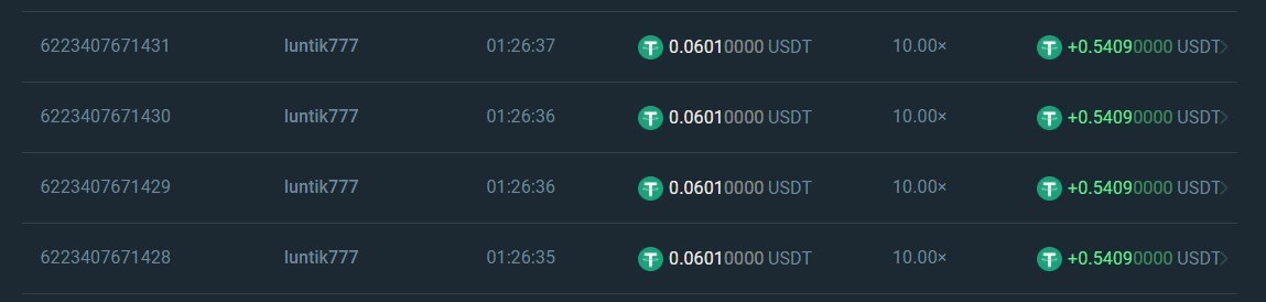 luntik777 Posted March 11, 2021 Share Posted March 11, 2021 ID bet : 6223407671431 6223407671430 6223407671429 6223407671428 I caught 4 in a row Amount : 0.06010000 USDT  the screenshot does not open BC_Panda  I sent screenchot it to you  PM and Telegramm  Link to comment Share on other sites More sharing options...