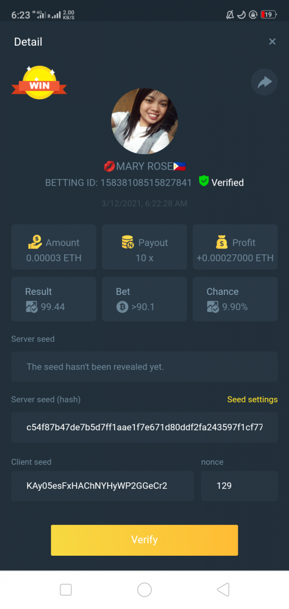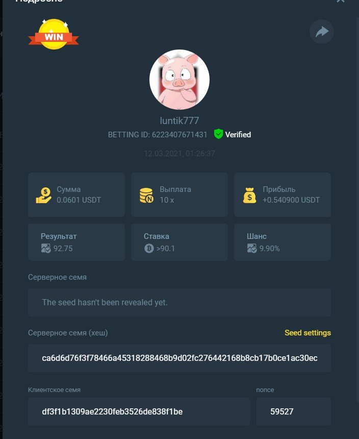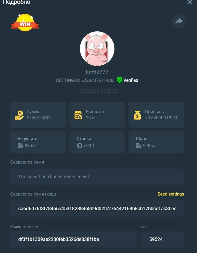 MARY.BC.GAME🇵🇠Posted March 11, 2021 Share Posted March 11, 2021 On 3/10/2021 at 9:37 PM, BC_Panda said:  Starts: 14:00, March 10th GMT Ends: 14:00, March 12th GMT  We’re excited to announce that we have three new coins available now at BC.Game !! And enjoy it more we are hosting 2 days contest where we will be giving 3 lucky winners $150 worth of new coins! Read on below to find out how you can win!  What's the Challenge? Win 2 or more consecutive bets with 10x (win chance 9.9%) on Classic Dice.  Minimum Bet Amount $0.05 equivalent  Eligible Coins All Coins are eligible as long as they match the minimum bet amount  Available Prizes 3 Winners will win $50 worth of BNB/TWT/CAKE each!  How to Enter the Challenge Take a screenshot displaying the bet details and send a reply to this thread with it. Must be able to see betting ID so that your bet can be verified. Please do not make multiple posts, just edit your original one if you need to add a new payout or replace a payout with a better qualifying amount. Nonce of all bets has to be consecutive   Disclaimer: Multiple accounts not allowed Fake screenshots will be checked and deleted        PEACE & LOVE Link to comment Share on other sites More sharing options...