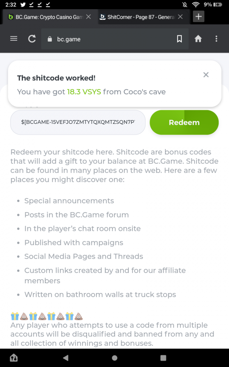 Each Shitcode serves 1 person one small amount you idiots. you cannot reuse a code. you know what works better. get a fucking job and whip out that american express and get some crypto anytime. No wait time. get it, its all urs, until u get pissed and go all in on dice with ur slider on "under 0.01"