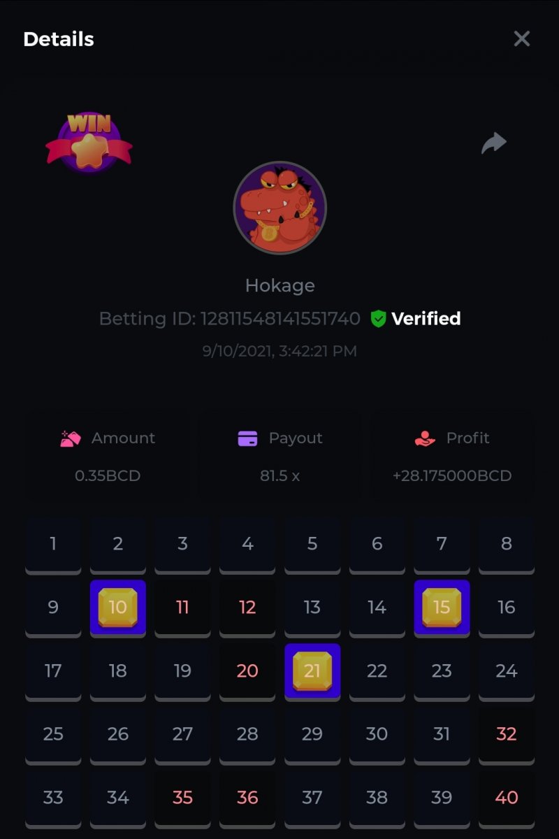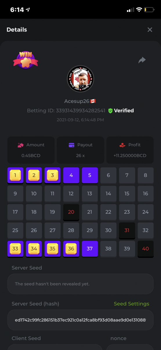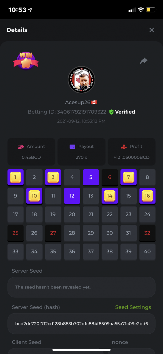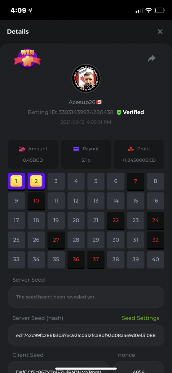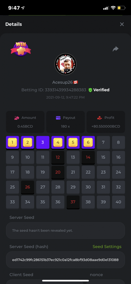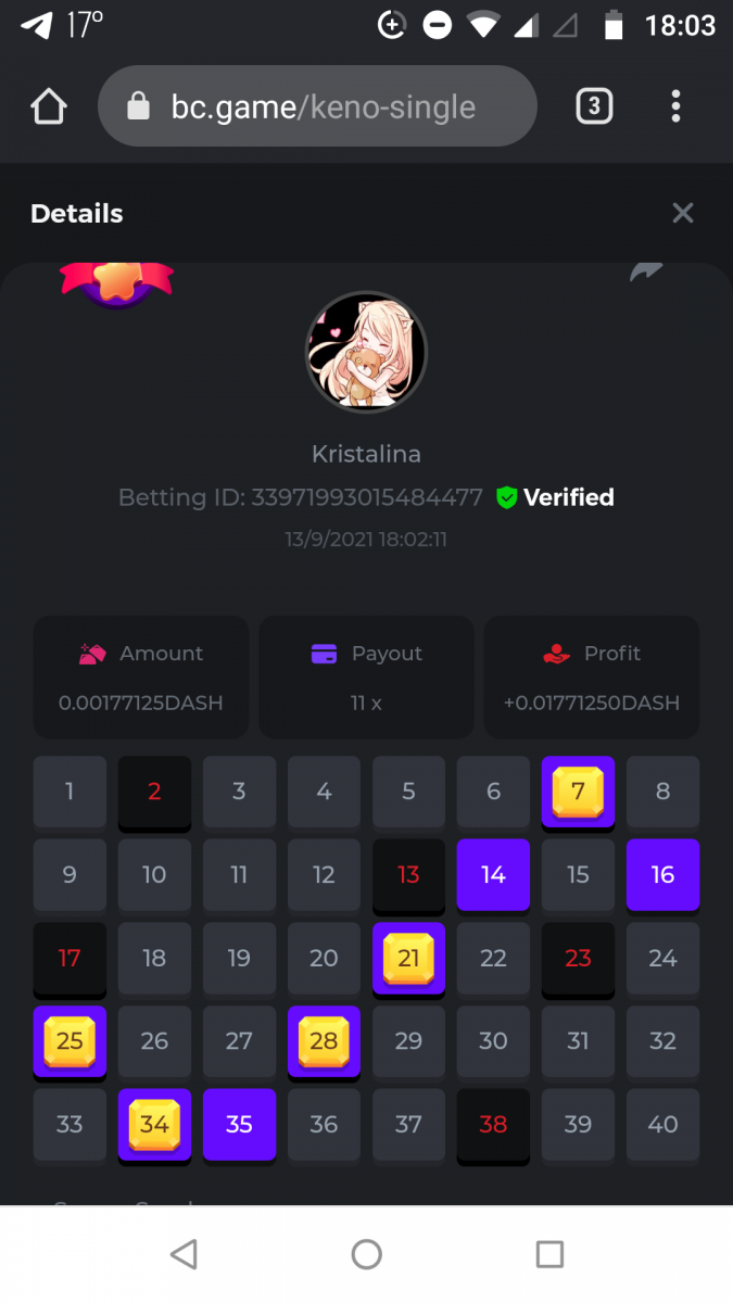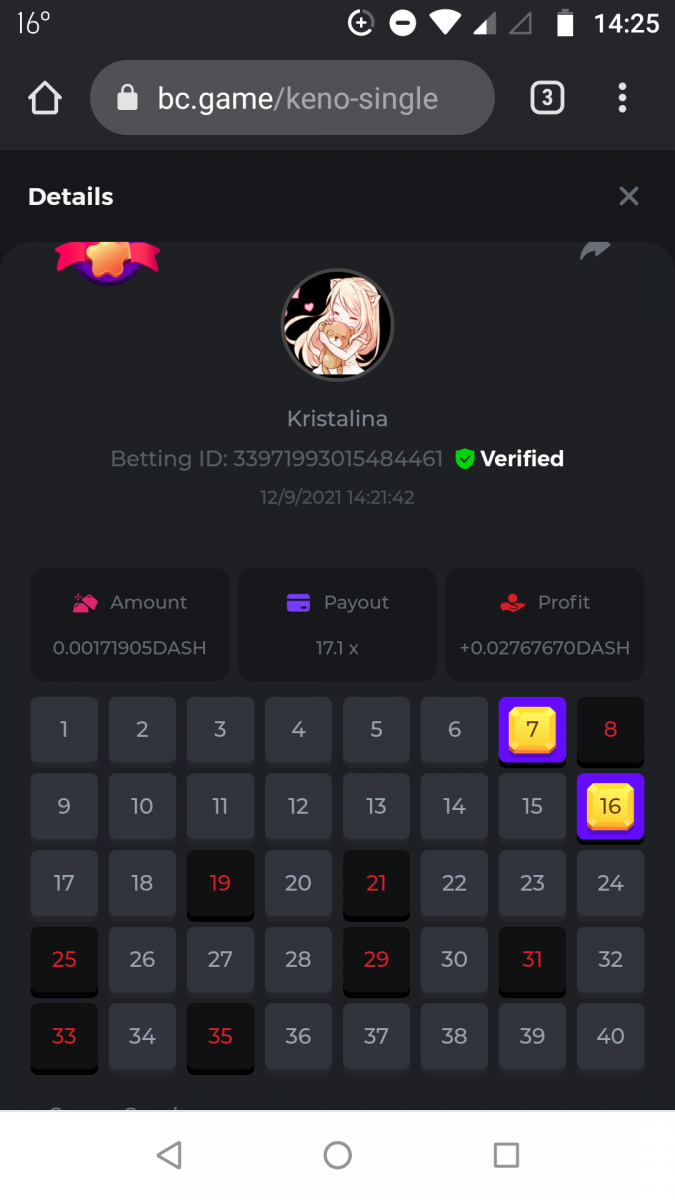 Nathsman Posted September 11, 2021 Share Posted September 11, 2021 On 6/9/2021 at 22:19, digitaldash said: DESAFÍO DE NIVEL SUPERIOR # 3 Inicio: 06:00, 7 de septiembre GMT Finaliza: 06:00, 14 de septiembre GMT ¡Bienvenido de nuevo! Quizás se pregunte por qué este desafío cuesta solo $ 2,000. Tendremos dos desafíos separados esta semana, y la segunda parte llegará muy pronto, ¡así que estén atentos a eso! ¡Esta semana, tenemos un desafío KENO! ¿Cuál es el desafío ? Complete la mayor cantidad de los siguientes 20 pagos en el modo multijugador de KENO o en el modo para un jugador de KENO . ¡Debes alcanzar un MÍNIMO de 5 de los pagos para calificar! 5.10x - 11x - 17.1x - 26x - 30x - 56x - 67x - 81.5x - 100x - 180x - 259x - 270x - 390x - 450x - 500x - 600x - 710x - 800x - 900x - 1000x Cada pago obtenido arriba cuenta como 1 punto, con un máximo de 20 puntos. Si hay un empate, el jugador con la apuesta total más alta (en USD) será el ganador. Los pagos deben ser resultados EXACTOS (56x y 50x no son lo mismo). Si no puede encontrar un pago, intente cambiar el nivel de riesgo a medio o alto. Nivel VIP mínimo Debe ser VIP10 o superior para participar en este desafío. Tamaño mínimo de la apuesta Equivalente a $ 0.35 (verifique los montos de monedas individuales a continuación) Monedas elegibles Todas las monedas son elegibles (excepto JB) Premios disponibles 1er lugar ...... $ 500 2do lugar ..... $ 375 3er puesto. .... $ 250 4to lugar ...... $ 125 5 ° al 25 ° ...... $ 25 Fondo de participación ... $ 250 dividido en partes iguales Cómo entrar Para participar, copie el ID de apuesta de la apuesta que le gustaría enviar. Una vez que lo haya copiado, publíquelo como respuesta a este hilo de la siguiente manera: ID de apuesta : 1708854428417660423 En la misma publicación, cargue una captura de pantalla de su ganancia haciendo clic en la ID del juego CON VISTA EN modo USD HABILITADO (accesible en la parte inferior del menú desplegable de su billetera en la parte superior. De esta manera, podemos asegurarnos de que su apuesta realmente cumplió con el requisito mínimo al momento de colocarlo: Combine todos sus éxitos en una SOLA publicación. Edita, no crees una nueva publicación. Las apuestas deben publicarse dentro de las 24 horas posteriores a la realización de la apuesta para que las cosas sean justas para todos. Las apuestas deben realizarse durante las ventanas de tiempo especificadas anteriormente. Este hilo se bloqueará automáticamente cuando termine el período de tiempo. Una (1) entrada por hogar . Cualquiera que intente ganar varios premios será descalificado de este desafío, así como de todos los desafíos futuros. Además, ¡irás al MURO DE LA VERGÜENZA para que todos vean que eres una estafa! Si no sigue las instrucciones, su envío será nulo y sin efecto. ¡Y que empiecen las carreras! Buena suerte a todos, esperamos ver quién gana esta semana. Link to comment Share on other sites More sharing options...