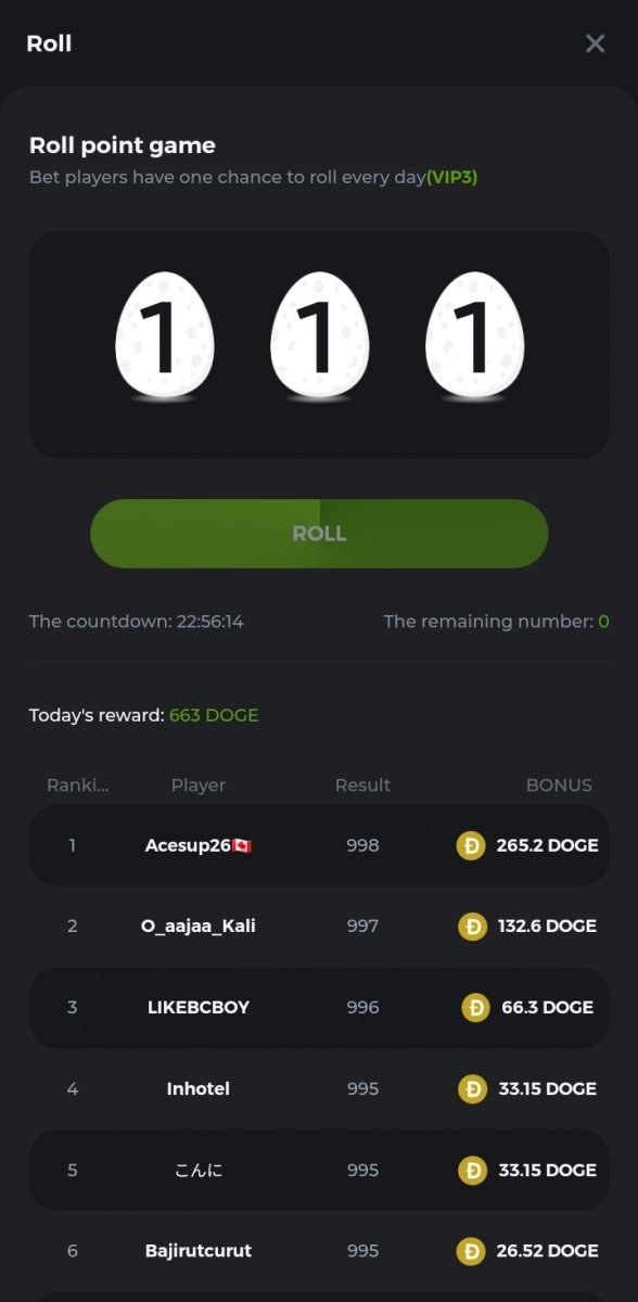 roll point game happens once a day..... 72 minutes ago the roll competition happened.... if u hit 1 1 1... then u won ... n u just need to post the screenshot here