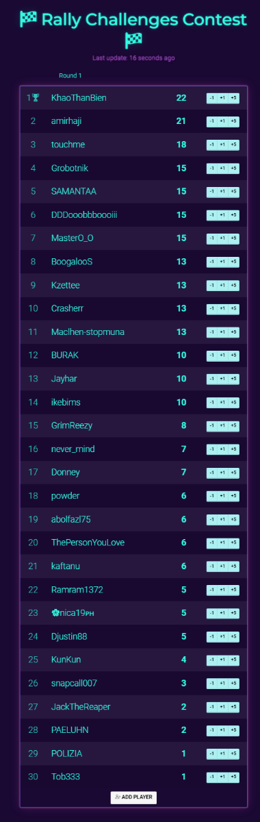 serendipityy Posted February 13, 2022 Author Share Posted February 13, 2022 RESULT ROUND 5 (FINAL ROUND) GAME : HASH DICE Rank Name Result Points 1 Jayhar 40000 10 2 KhaoThanBien 20000 9 3 MasterO_O 10001 8 4 SAMANTAA 10000 7 5 ThePersonYouLove 8888 6 6 Grobotnik 8000 5 7 amirhaji 8000 4 8 abolfazl75 7500 3 9 PAELUHN 5869 2 10 GrimReezy 3333 1 Kzettee 2222 DDDooobbboooiii 1799 kaftanu 1337 Jungren 1000 powder 681 Jungren 500 hadiiiiiiii 444 Maclhen-stopmuna 409 MIKEAWUAH 50 BoogalooS Winner Top 10 "Some people don't mean what they say and some people don't say what they mean" Link to comment Share on other sites More sharing options...
